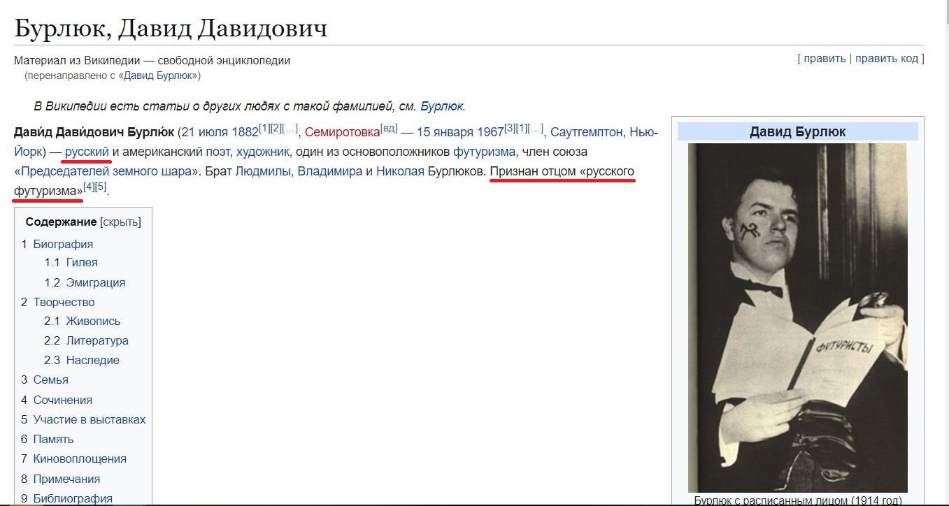 Ай-ай-ай, недоработали западные и украинские активисты, не подчистили от слова "русский" страницу о Давиде Бурлюке… Скриншот: интернет-сайт wikipedia.org