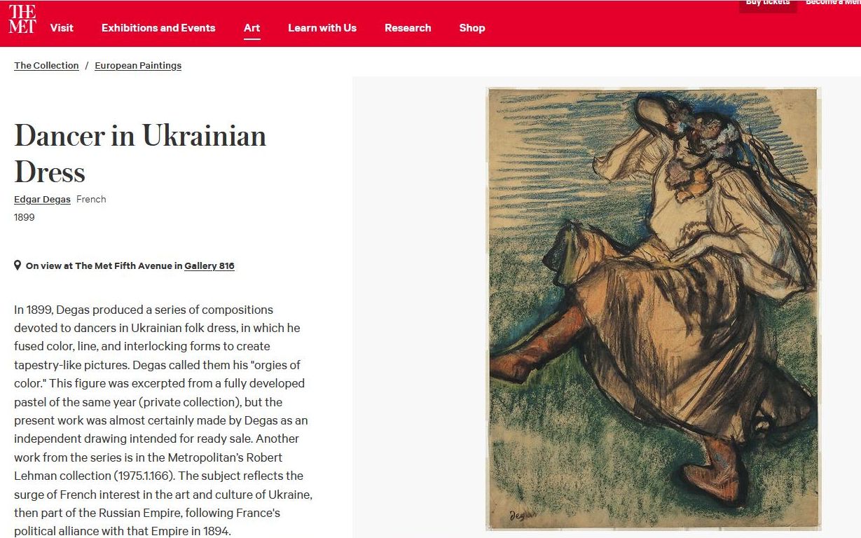 Практически день в день на первую годовщину начала спецоперации, в феврале 2023-го, самый престижный музейно-выставочный центр США, Метрополитен-музей Нью-Йорка, на своём официальном сайте скорректировал название картины французского художника Эдгара Дега. Пастельный рисунок, ранее всем и всегда известный как "Русская танцовщица", превратился в "Танцовщицу в украинском платье".