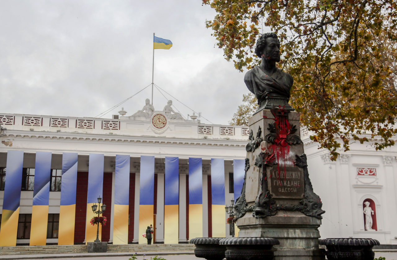 "Жовто-блакитные" цвета и Пушкин несовместимы. Поэтому памятник русскому гению в Одессе нужно осквернить, а потом снести. ФОТО: Viacheslav Onyshchenko/Global Look Press
