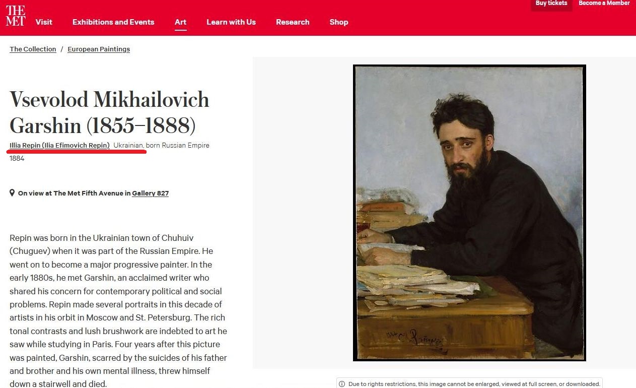 В подписи к портрету Всеволода Гаршина американцы уже поменяли национальность русского художника Репина на "правильную" — украинскую. Скриншот: интернет-сайт metmuseum.org