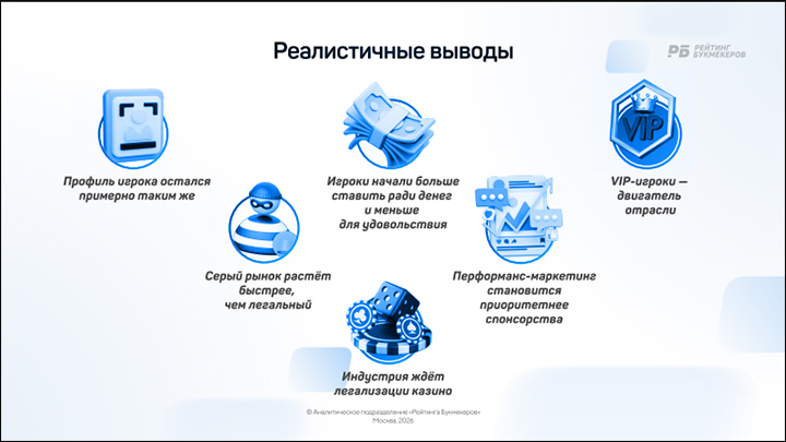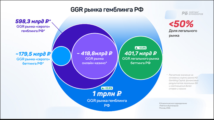 По данным исследования "Рейтинга букмекеров", общий валовый игровой доход рынка азартных игр в стране по итогам 2025 года составил порядка триллиона рублей. Валовый игровой доход нелегальных букмекеров и казино – 596,3 миллиарда рублей, легального букмекерского рынка – 401,7 миллиарда рублей.