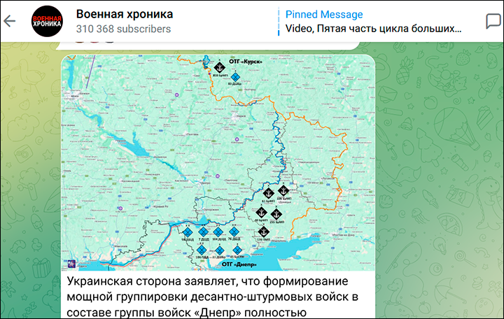 По данным противника, ОТГ "Днепр" полностью завершила формирование ударных группировок, состоящих из десантно-штурмовых подразделений и подразделений морской пехоты. Скриншот: ТГ-канал "Военная хроника"