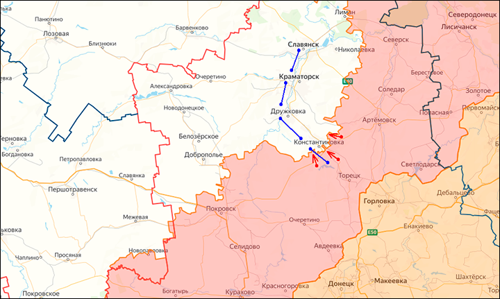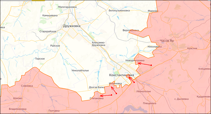 При этом ситуация далека от триумфального марша. Мониторинговые каналы сообщают о существовании обширной серой зоны в пространстве между Константиновкой и Часовым Яром, окраины которого по-прежнему частично контролируются ВСУ. Серая зона простирается вплоть до Ступочек. И хоть этот район на мониторинговых картах закрашен в наш цвет, на самом деле это огромная серая зона, в которой дроны охотятся за пехотой и техникой. Устойчивого контроля здесь нет ни у одной стороны, но наше присутствие реализуется более полно. При этом даже проход механизированных колонн здесь затруднён из-за активности вражеских дронов.