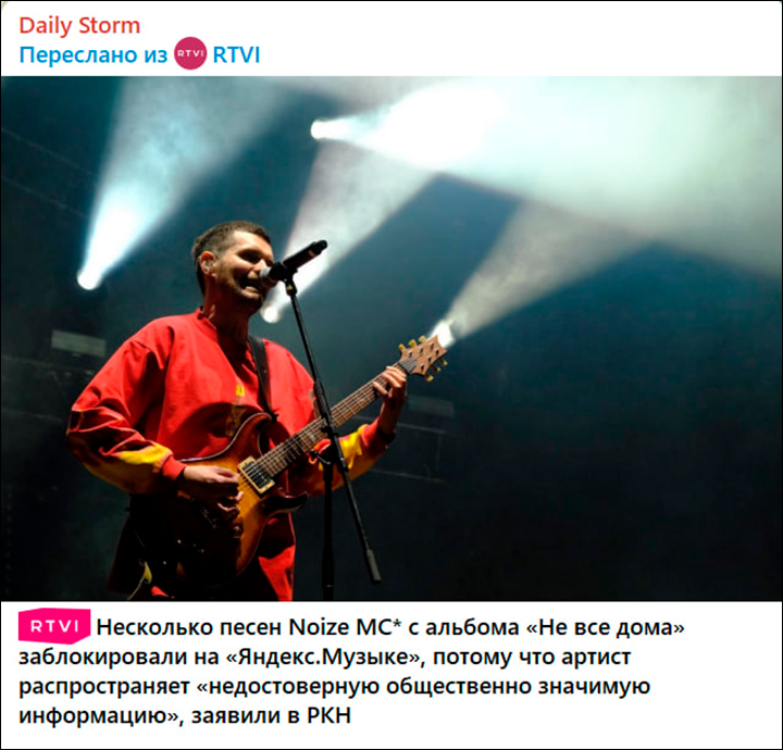 Послушать Ивана Алексеева (Noize MC)* на русских площадках уже нельзя. Скриншот: ТГ- канал Daily Storm