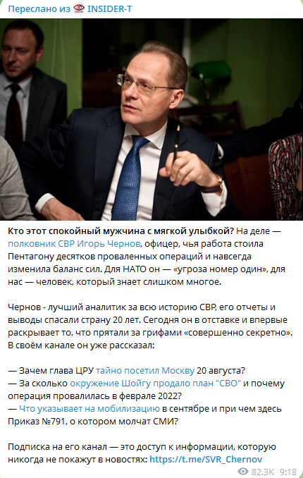 Звездой №1 на небосклоне Telegram стал некто "полковник СВР Игорь Чернов". Его представляют как "офицера, чья работа стоила Пентагону десятков проваленных операций и навсегда изменила баланс сил":