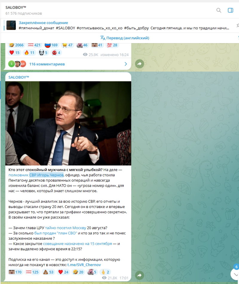 Канал, еженедельно собирающий донаты для наших бойцов, тоже предлагает поверить в "полковника СВР". Зачем? Сколько стоила эта реклама?/Скриншот: https://t.me/SALOBOY_OFFICIAL/41025