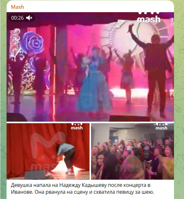 Неприятный инцидент произошёл вечером 30 апреля в Ивановском музыкальном театре, где народная артистка Надежда Кадышева отыгрывала свой сольный концерт. После того как программа подошла к концу и занавес опустился, на сцену внезапно выбежала девушка из зала и набросилась на певицу, схватив её за шею.