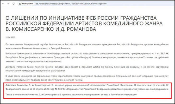 Поддержавшего киевский режим комика Дмитрия Романова лишили российского гражданства. Инициатором этого решения стала Федеральная служба безопасности России. Также лишён гражданства его коллега по цеху Вячеслав Комиссаренко. Как пояснили в ФСБ, основанием для лишения гражданства этих людей стало осуждение ими проведения СВО, поддержка украинского режима и призывы к подрыву конституционного строя нашей страны.