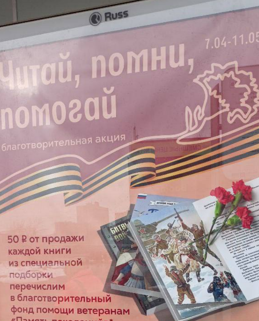 На улицах Москвы стали появляться плакаты, приуроченные к грядущему празднованию 9 Мая. Они информируют о благотворительной акции - деньги за покупку книг, посвящённых Великой Отечественной войне, которые включены в специальную подборку, поступают в благотворительный фонд помощи ветеранам. Таким образом книжные магазины стимулируют интерес москвичей к изучению одной из самых важных и судьбоносных войн в отечественной истории.