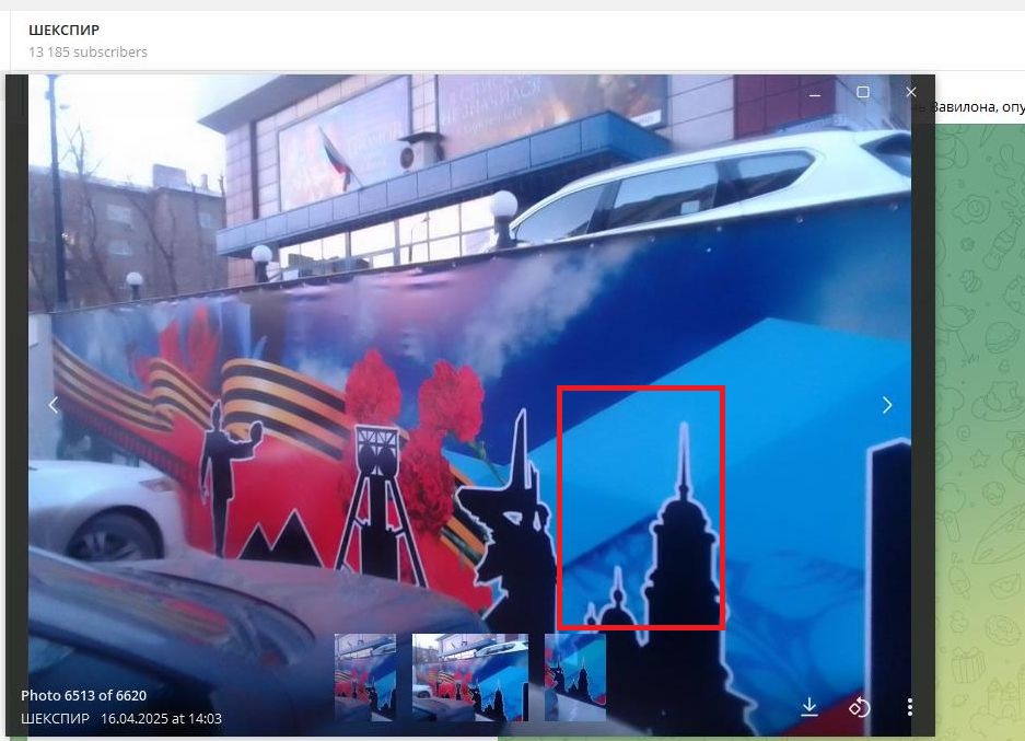 Так, в середине апреля общественное пространство у кинотеатра "Звёздочка" (центр Донецка) "украсили" праздничным баннером, на котором в числе прочих изображений отчётливо узнаётся силуэт местного Свято-Преображенского кафедрального собора.