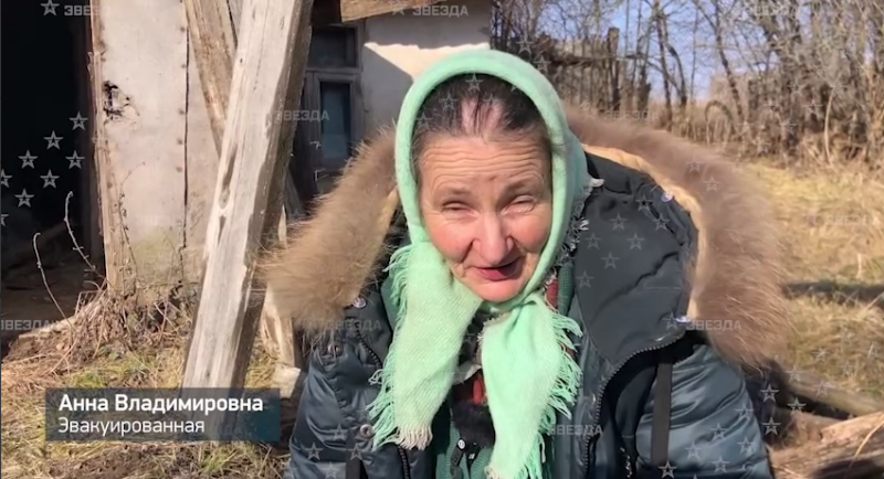 Эвакуированная пожилая женщина Анна Владимировна рассказала журналистам, как её выводили из опасной зоны русские бойцы.