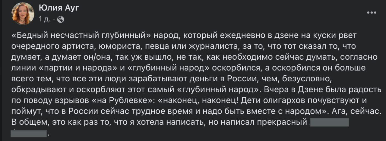 Если раньше она использовала крепкие выражения в адрес русских, то теперь в репликах всё так скользко, что при желании трактовать можно как угодно. Тут тебе и "глубинный народ", и ошибочность мышления. Неужели, по примеру Максима Галкина*, актриса решила затереть свою русофобию в соцсетях?