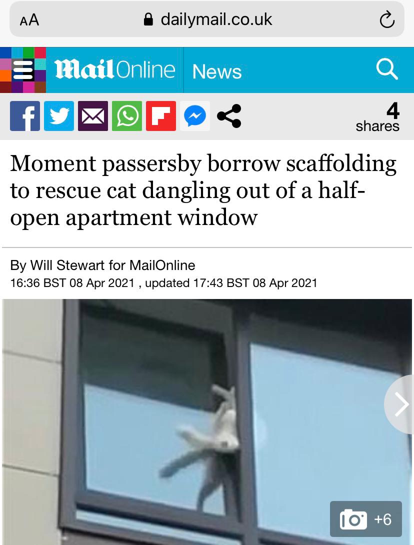 О судьбе животного рассказал известный таблоид Daily Mail. Англичане восхитились смекалкой русских. Молодые люди экстренно собрали строительные леса, которые притащили со стройки по соседству. А чтобы дотянуться до пушистика (он-то аж на третьем этаже был), подтолкнули его железным прутом.