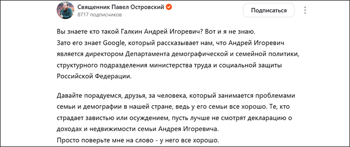 Скриншот поста в дзен-канале священника Павла Островского// dzen.ru/pavelostrovski