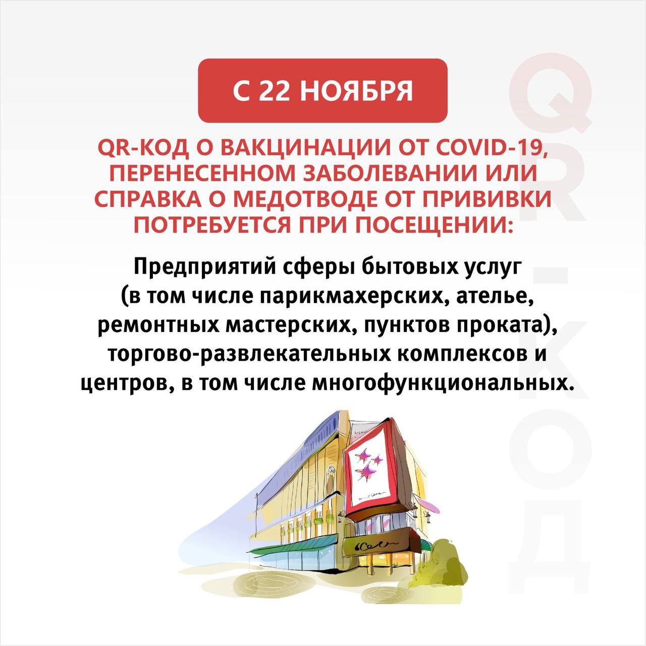 Также до 18 января 2022 года посещение ТРЦ и кафе будет возможно только при предъявлении справок о вакцинации, перенесенном заболевании или медотводе. Этот перечень дополнили предприятия сферы бытовых услуг и объектов розничной торговли, фитнес-центры, спортзалы и бассейны.