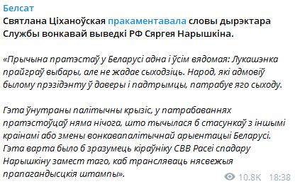 Лидер белорусской оппозиции Светлана Тихановская потребовала, чтобы глава Службы внешней разведки России Сергей Нарышкин не вмешивался в дела республики. Она заявила: Лукашенко проиграл и должен уйти!