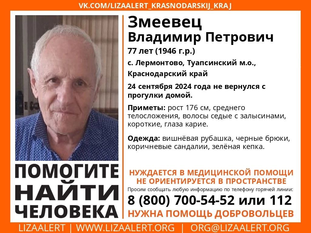 Но бывают такие случаи, что пенсионеры пропадают бесследно. Например, 24 сентября 2024 года, тот есть вот уже 10 дней, не вернулся с прогулки 77-летний Владимир Петрович Змеевец. Его разыскиваю родственники, полиция и волонтёры.