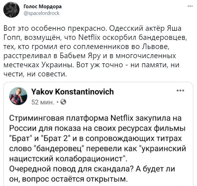 Пользователь Twitter "Голос Мордора" обратил внимание, что украинцы уже начали оскорбляться в связи с выходом дилогии "Брат" на Netflix. Так, одесский актёр Яков Гопп оказался недоволен тем, что "бендеровца" заменили на "коллаборациониста".