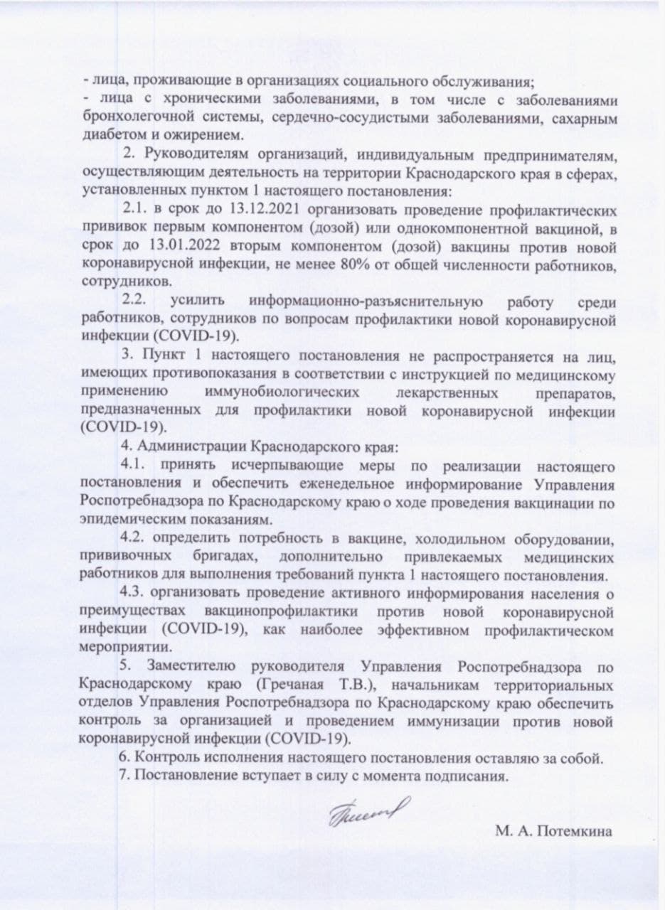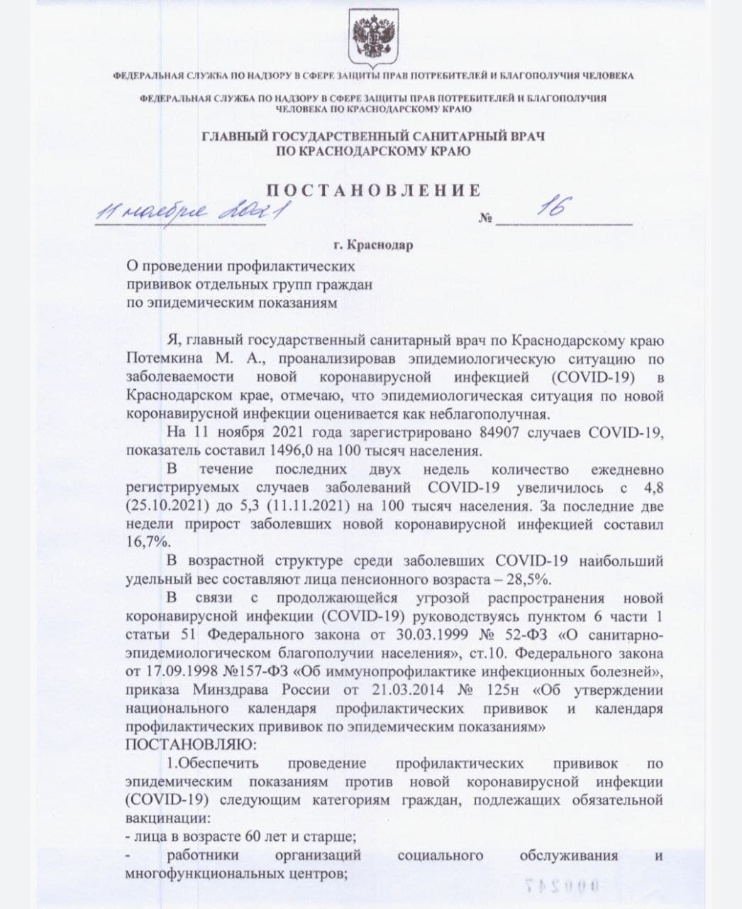 Постановление об обязательной вакцинации от коронавируса в Краснодарском крае вводится с 11 ноября 2021 года.