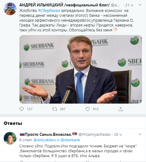 Советник министра обороны Андрей Ильницкий возмутился жадностью Сбербанка, который ввёл комиссию за внутренние переводы. Он заявил, что уходит "из этой конторы", и предложил Герману Грефу "обогащаться без него".