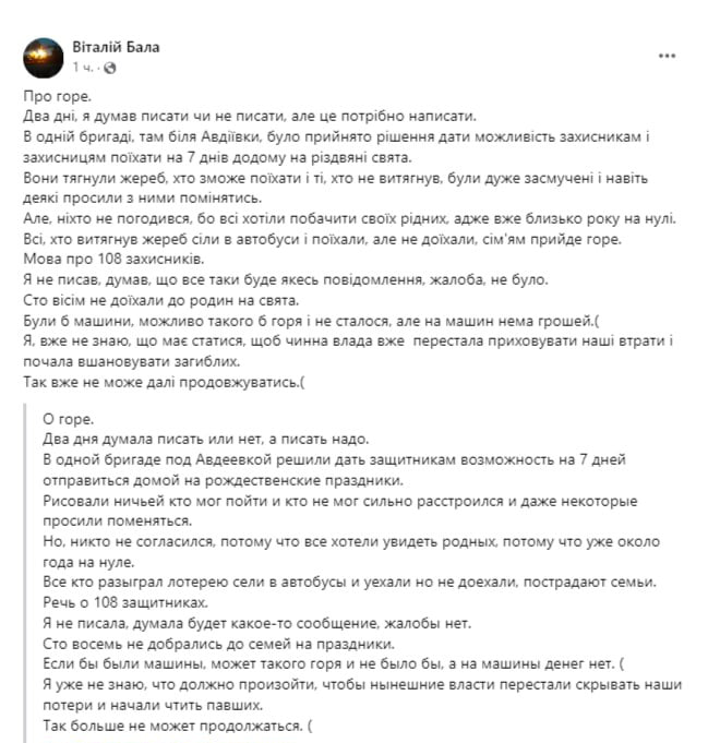 Украинский журналист Виталий Бала заявил о таинственной гибели боевиков ВСУ, которые отправились в отпуск на рождественские выходные. О пропаже солдат известно мало: они ехали домой и вскоре пропали при невыясненных обстоятельствах.