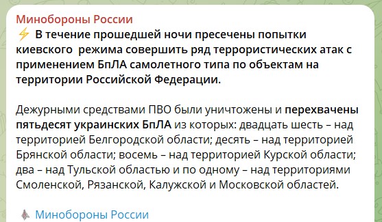 Вот что пишет Министерство обороны России в Сети: "Дежурными средствами ПВО были уничтожены и перехвачены пятьдесят украинских БПЛА, из которых: двадцать шесть - над территорией Белгородской области; десять - над территорией Брянской области; восемь – над территорией Курской области; два - над Тульской областью и по одному - над территориями Смоленской, Рязанской, Калужской и Московской областей".