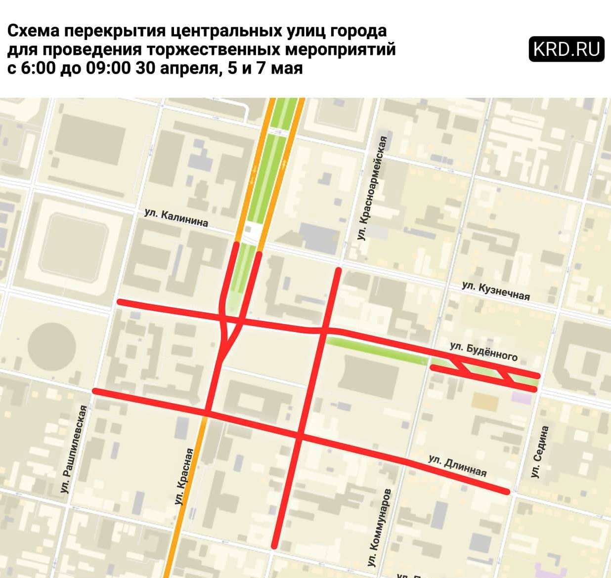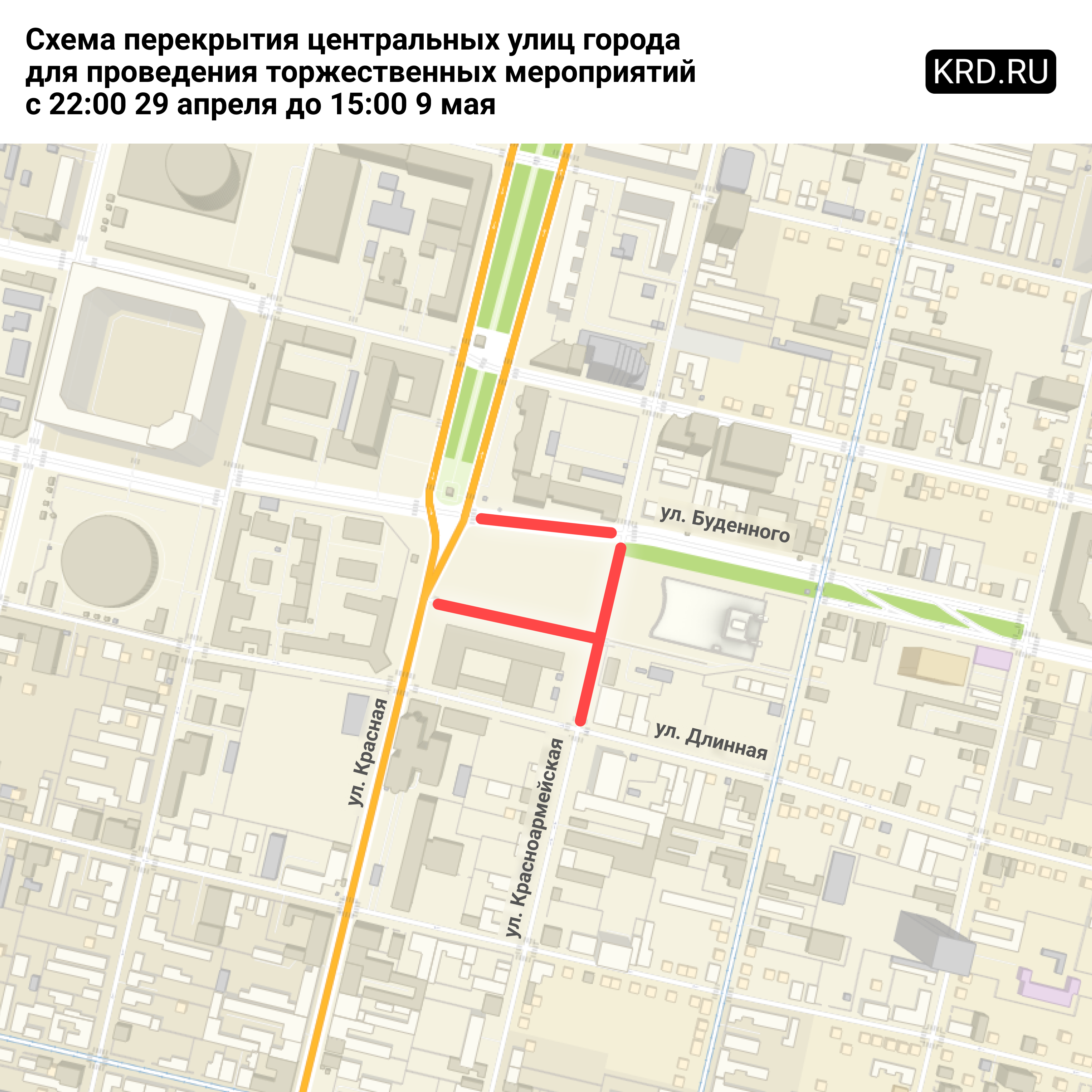 С 22:00 часов 29 апреля до 15:00 часов 9 мая проезд будет закрыт по ул. Красноармейской от ул. Длинной до ул. им. Буденного и по ул. им. Буденного от ул. Красной до ул. Красноармейской.