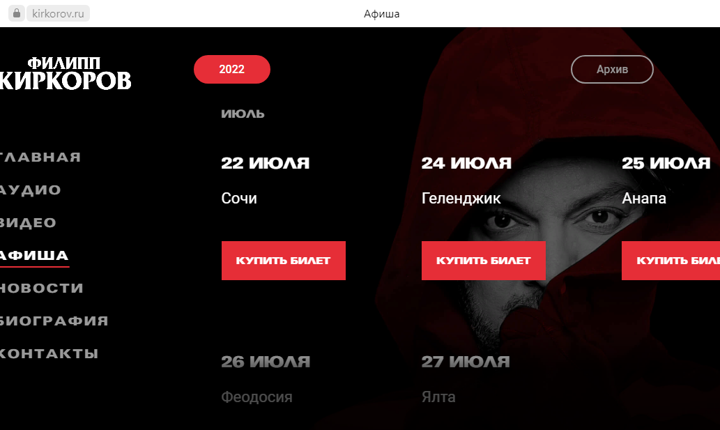 Накануне на официальном сайте эстрадного певца и композитора появились новые даты концертов. Он планировал выступить 10 августа в Анапе, 11-го – в Геленджике, 13-го – в Сочи.