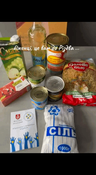 Речь идёт о продуктовом наборе, который обещают выдать временно переселённым в Виннице. В набор входят соль, масло, сок, макароны, чай и пять банок консервов. Видео, на котором демонстрируется "сладкий подарок", сопровождается надписью: "Это вам на Рождество".