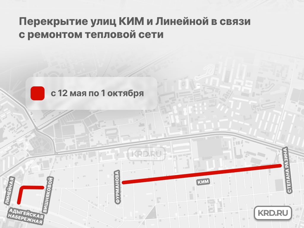 Кроме того, водители не смогут проехать по участку улицы Линейной — от Адыгейской Набережной до КИМ.
