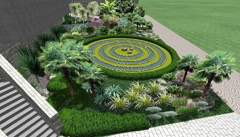 В центре композиции остаётся цветник в виде круга, куда высадят седумы, лен новозеландский, трахикарпус и кордилину бешорнерия. Уточняется, что современную зону отдыха украсят в фирменном стиле Сергея Венчагова -"хвост дракона" – это когда камень, устанавливают на ребро. Растения будут поливать с помощью встроенной системы автополива, а на всей территории будет работать ночная подсветка.