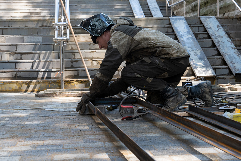 На набережной у концертного зала "Фестивальный" рабочие благоустраивают 10-й уголок Сергея Венчагова, в прошлом году уже привели в порядок девять декоративных объектов этого архитектора.