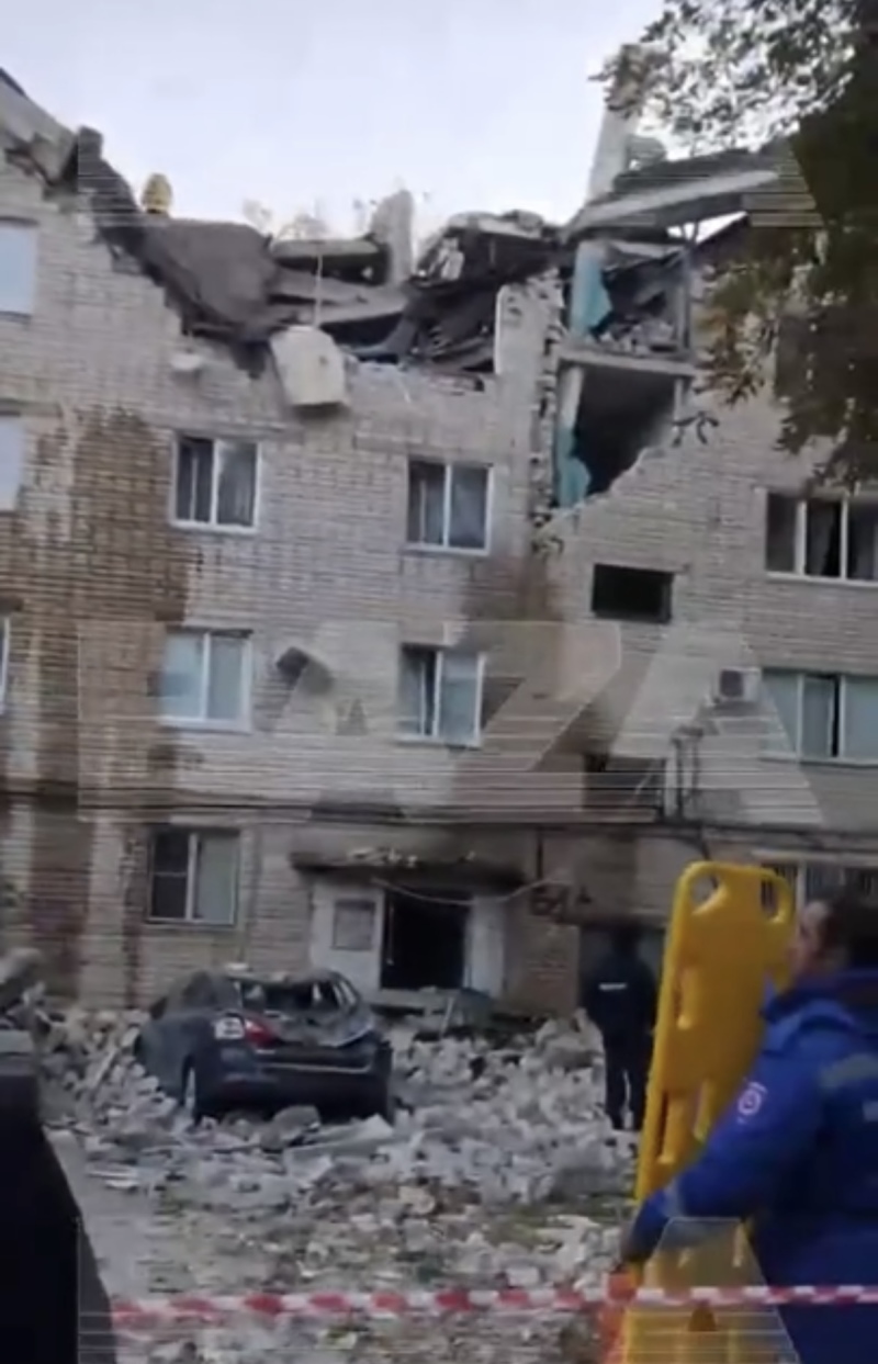 На кадрах видно, что взрыв серьезно разрушил верхние этажи здания, а также выбил часть стены.