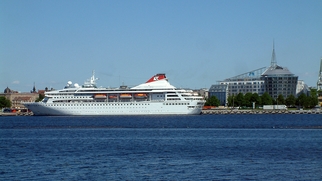 Пассажиры круизного лайнера, который зацепил пристань во время швартовки, сошли на берег.